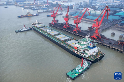 12月29日,南通港一處碼頭準(zhǔn)備卸運電煤(無人機照片)。(新華社發(fā) 許叢軍 攝)