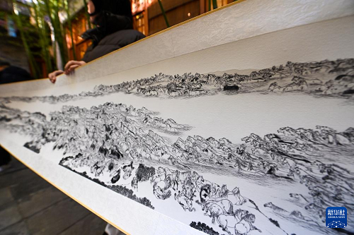 這是12月29日在天津古文化街“喜迎馬年,五代畫馬人馬畫藝術(shù)展”上拍攝的畫家宮春虎的作品《萬馬圖》(局部)。(新華社記者 趙子碩 攝)
