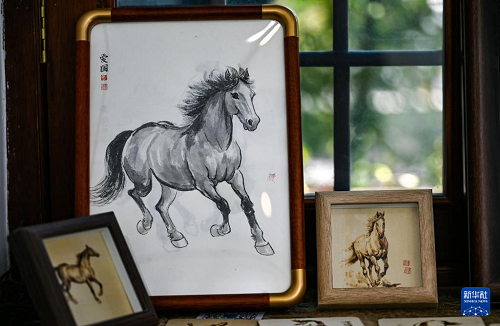 這是12月29日在天津古文化街“喜迎馬年,五代畫馬人馬畫藝術(shù)展”上拍攝的畫作。(新華社記者 趙子碩 攝)