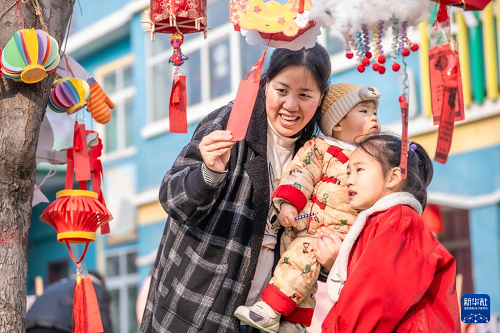 12月30日,在河南省駐馬店市西平縣一所幼兒園的元旦親子游園廟會上,小朋友和家人一同參與猜燈謎游戲。(新華社發(fā) 趙永濤 攝)