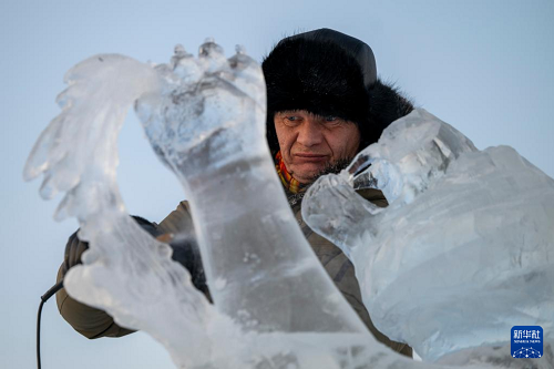 1月3日,參賽選手在哈爾濱冰雪大世界園區(qū)內(nèi)進(jìn)行冰雕創(chuàng)作。(新華社記者 張濤 攝)