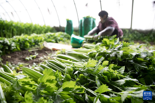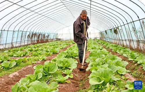 1月20日,在浙江省臺州市仙居縣官路鎮(zhèn),菜農(nóng)在大棚中為蔬菜松土、除草。(新華社發(fā) 王華斌 攝)