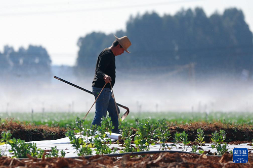 1月20日,在云南省曲靖市陸良縣芳華鎮(zhèn)雙合村,農(nóng)民為小春馬鈴薯覆蓋地膜。(新華社發(fā) 王勇 攝)