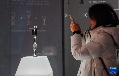 1月27日,在山東博物館“對(duì)話蛋殼黑陶高柄杯”明星文物展上,一名參觀者觀看龍山文化蛋殼黑陶高柄杯。(新華社記者 徐速繪 攝)