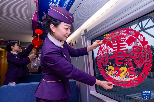 2月11日,南京客運(yùn)段G2584次列車乘務(wù)員在餐車內(nèi)貼窗花。(新華社發(fā) 湯德宏 攝)