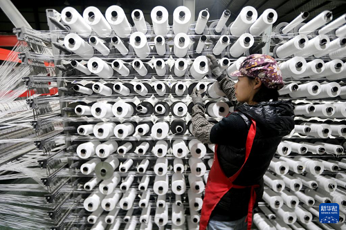 2月24日,在江蘇省連云港市連云區(qū)一家編織袋生產(chǎn)企業(yè),工人忙著趕制訂單產(chǎn)品。(新華社發(fā) 王春 攝)