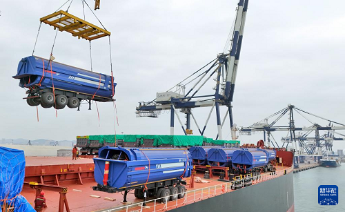 2月24日,在山東港口煙臺港,工人將出口卡車吊裝上船(無人機(jī)照片)。(新華社發(fā) 唐克 攝)
