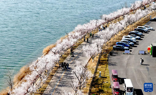3月16日,游客在河北省石家莊市滹沱河畔賞花游玩(無人機照片)。(新華社發(fā) 陳其保 攝)