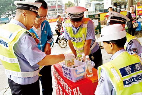 考試期間,市公安局交警支隊(duì)在各考點(diǎn)設(shè)置了便民服務(wù)點(diǎn),備好遮陽傘、雨傘、保溫水桶、礦泉水和考試專用的鋼筆、橡皮。便民服務(wù)臺還放置一個小藥箱,里面?zhèn)溆星鍥鲇?、防暑藥、藿香正氣水、感冒藥、腹瀉藥、速效救心丸、降壓藥等應(yīng)急藥品,以防考生及家長急用。