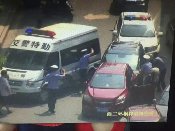 長沙交警特勤大隊民警在桐梓坡路西二環(huán)橋下開展例行酒駕整治時,車牌為湘A27K07的黑色小型越野車駕駛?cè)司懿幌ɑ?,并緊閉車門、車窗,拒絕出示相關(guān)證件和下車配合接受酒精測試。 圖片來源于新浪微博