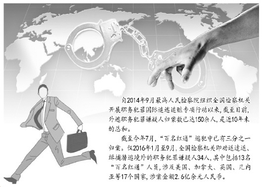 據(jù)了解,截至今年7月,“百名紅通”逃犯中已有三分之一歸案。僅2016年1月至9月,全國檢察機(jī)關(guān)即勸返遣返、緝捕潛逃境外的職務(wù)犯罪嫌疑人34人,其中包括裴健強(qiáng)、陳祎娟、付耀波、周世勤等13名“百名紅通”人員,涉及美國、加拿大、英國、幾內(nèi)亞等17個國家,涉案金額2.6億余元人民幣。