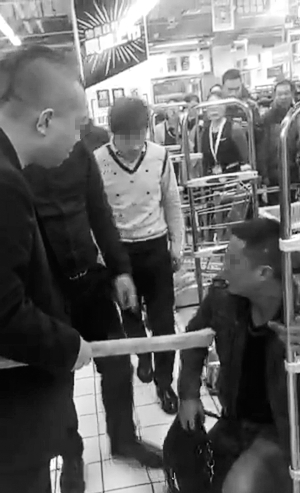 昨天,一段視頻在網(wǎng)上被熱議?!霸俨凰砷_把你腿削折了”,一棕色外套男子被逼跪在地上,抱著收銀臺(tái)附近的欄桿連連承諾“再不來(lái)了”。另外兩個(gè)大漢在旁拖拽他,其中一人用木棒打向男子,另一人在旁邊踢了該男子一腳,并威脅道:“再來(lái)讓你沒命”(如圖)。
