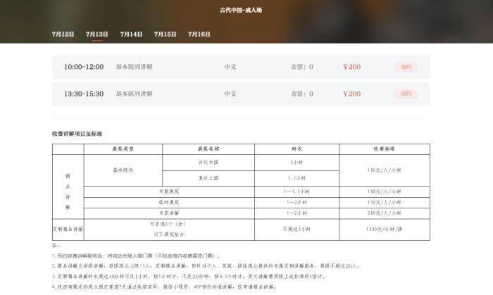 古代中國展收費講解項目及標(biāo)準(zhǔn) 截圖自國家博物館官網(wǎng)