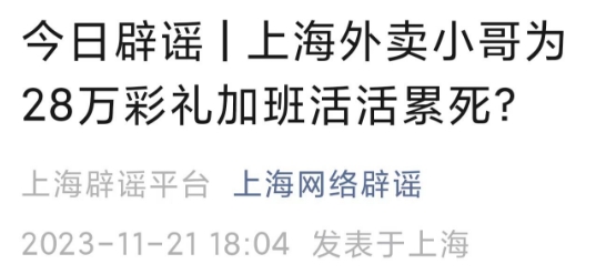 11月20日,上海網(wǎng)絡(luò)辟謠微信官方賬號(hào)發(fā)布辟謠文章。針對(duì)近日網(wǎng)傳“為掙28萬(wàn)彩禮娶媳婦,上海外賣小哥活活累死”一事,經(jīng)過(guò)核查發(fā)現(xiàn),事件純屬自媒體捏造散布。