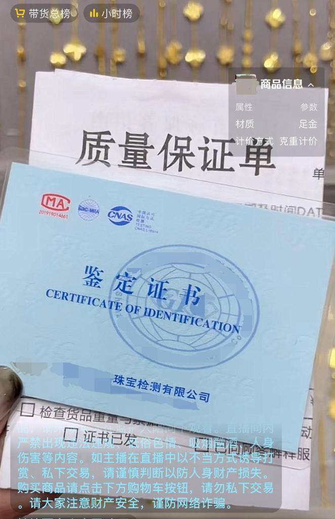 圖為某平臺(tái)店鋪主播展示其所售黃金產(chǎn)品的“鑒定證書”。