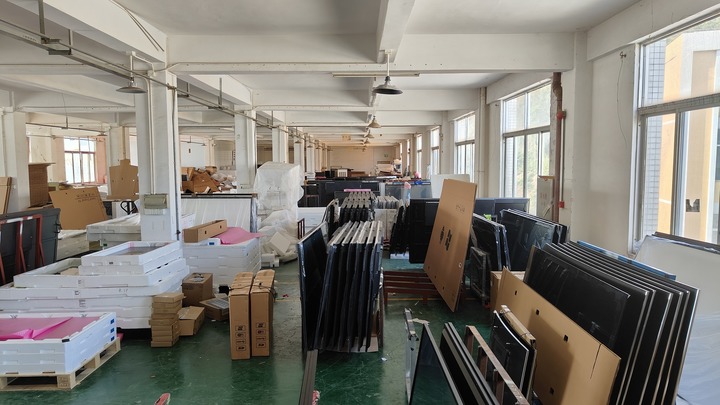 專案組查處違法組裝電視機的車間時發(fā)現(xiàn),庫房內(nèi)堆積著大量電視機外殼、主板和白板顯示屏,還有很多品牌透明貼紙,以及部分準(zhǔn)備發(fā)出和退回的假冒品牌電視機。