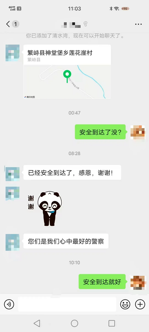 接到報警后,神堂堡派出所民警迅速通過電話聯(lián)系報警人,得知車上共有七人,多為婦女兒童,民警首先安撫游客情緒,并在確定具體地點后,立即與神堂堡交警中隊民警驅車趕往事發(fā)地。到達現(xiàn)場后,民警了解到,報警人張某與家人朋友自駕前往五臺山旅游,開到蓮花崖大峽谷山區(qū)路段時由于路面有冰導致車輛打滑沖出路面,車輛正被困在一處斜坡處,距離前面的深溝只有一米左右,進退兩難,無法動彈。此時,車上幾名游客已凍得瑟瑟發(fā)抖,情況不容樂觀。民警們第一時間制定救援措施,他們不畏嚴寒、相互配合,經(jīng)過長時間的努力,終于將被困車輛從冰面推到了無冰路段。車輛脫困,游客對民警們的及時救援表示了由衷的感謝,緊緊握住民警的手,激動地說:“非常感謝警察同志的幫助,您們是我們心中最好的警察!”
