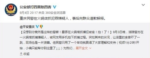 事后,有媒體了解到這名道歉者是來自重慶市涪陵區(qū)公安局荔枝派出所的一名民警。據(jù)他介紹,當(dāng)時是正在對一名長期吸販毒的犯罪嫌疑人實(shí)施抓捕。由于嫌疑人吸食毒品精神亢奮且隨身攜有刀具,抓捕過程比較激烈,不少店內(nèi)客人都起身圍觀,有些還拿出手機(jī)拍攝。抓捕結(jié)束后,帶隊(duì)民警第一時間找來餐館老板,亮明身份后表示警方會妥善處理餐館損失,并且特意向店內(nèi)顧客道歉,于是就有了視頻中顯示的畫面。
