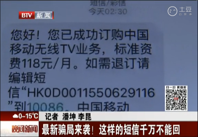 中國經(jīng)濟網(wǎng)北京11月4日訊 “您好!您已成功訂購中國移動無線TV業(yè)務,標準資費118元/月。如需退訂,請編輯短信HK***到10086。【中國移動】”11月2日北京電視臺《晚間新聞》報道,近日,北京市民王小姐收到了“中國移動”發(fā)來的這樣一條服務訂購短信。