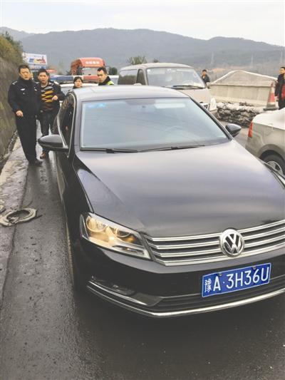警方擋獲的嫌疑人挾持人質(zhì)沖關(guān)的其中一輛黑色大眾轎車(chē)