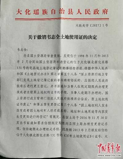 2月9日,大化縣人民政府下發(fā)大政處字〔2017〕1號文《關于撤銷韋志全土地使用證的決定》。 中國青年報·中青在線記者 謝洋/攝