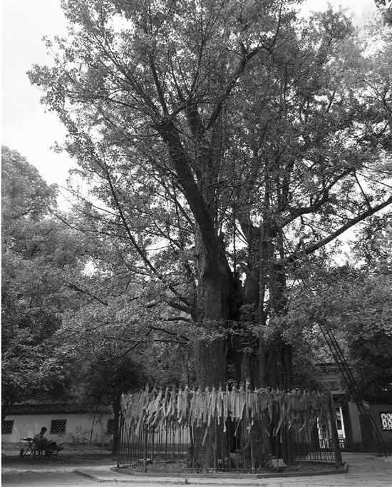 記者專程去西湖邊的五云山,去看山頂那棵杭州最古老的樹,1400多年的銀杏。爬上山,在山頂一眼望過去,就是那棵古老的銀杏,四周圍欄上系滿了紅色的祈福飄帶。20多米高的樹干和巨大的樹冠讓樹蔭下乘涼的人顯得很小。樹后面就是真際寺,里面小賣部的老板說,天天都有人跑來看這棵樹,再等幾個(gè)月,秋天銀杏葉黃的時(shí)候,別提多好看了。