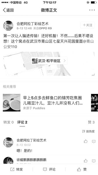上車(chē)后,在確認(rèn)自己已經(jīng)安全的情況下,小王拿出手機(jī),在微博上@青山公安110舉報(bào)了該傳銷(xiāo)窩點(diǎn),并提供了青山區(qū)和平大道附近該小區(qū)的定位。