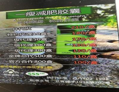 按照規(guī)定,一瘦減肥膠囊(微商俗稱“小綠”)進(jìn)貨800盒及以上,才能成為官方合作商,進(jìn)貨價一盒100元。此外,進(jìn)貨500盒、300盒、100盒、50盒,分別成為金牌總代理、一級代理、二級代理、三級代理,進(jìn)貨價每盒對應(yīng)分別為110元、130元、150元、170元。若代發(fā)貨一盒,則為210元。