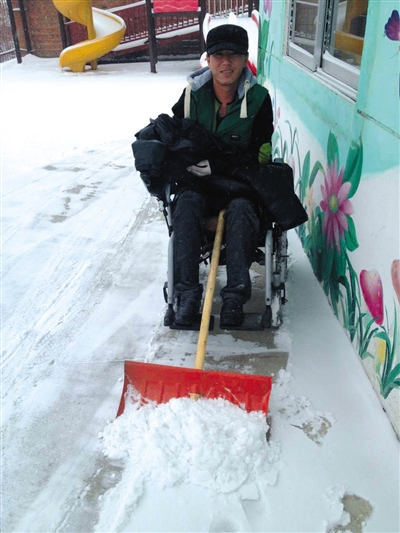 今年冬天,戴著假肢,坐著輪椅的宋學(xué)文在吉林老家掃雪。受訪者供圖