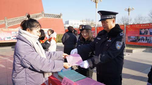 近日,市公安局忻府分局民警走上街頭,向市民發(fā)放《中華人民共和國(guó)憲法》等宣傳資料,對(duì)市民提出的各類法律問(wèn)題予以細(xì)致解答,贏得了群眾的一致好評(píng)。魯明強(qiáng) 攝