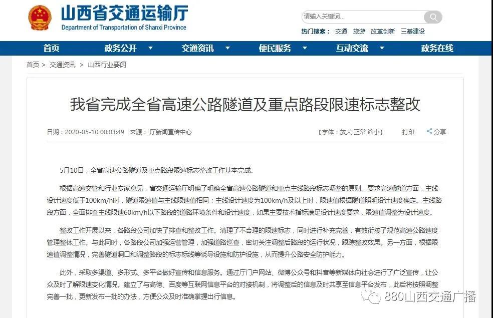 從山西省交通運(yùn)輸廳獲悉,山西已于5月10日完成了全省高速公路隧道及重點(diǎn)路段限速標(biāo)志整改工作,并將于今年8月1日前完成全省高速公路、一級(jí)國省干線公路限速標(biāo)志的整改完善,其中要重點(diǎn)解決社會(huì)反映強(qiáng)烈的“斷崖式”“隱蔽式”等不合理的限速問題。