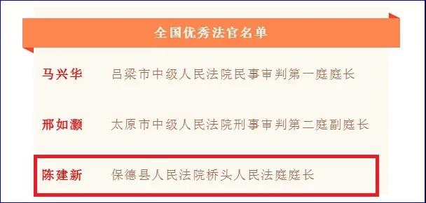 近日,在全國高級法院院長會上,為表彰先進、激勵隊伍,最高人民法院決定授予83個單位“全國優(yōu)秀法院”稱號,授予97名同志“全國優(yōu)秀法官”稱號,追授2名同志“全國優(yōu)秀法官”稱號,授予198名同志“全國法院辦案標(biāo)兵”稱號。其中忻州法院系統(tǒng)一名員額法官榮獲“全國優(yōu)秀法官”稱號。