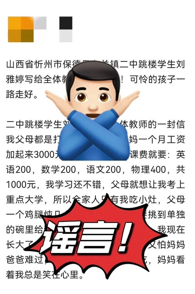 2024年3月18日,忻州網(wǎng)警在工作中發(fā)現(xiàn),網(wǎng)民鄔某在某平臺(tái)發(fā)文稱“山西省忻州市保德縣東關(guān)鎮(zhèn)二中跳樓學(xué)生小劉(化名)寫給全體教師的一封信”。