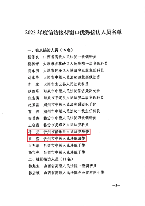 近日,山西省高級(jí)人民法院下發(fā)《關(guān)于對(duì)2023年度信訪接待窗口優(yōu)秀接訪人員予以表?yè)P(yáng)的通報(bào)》,忻州法院2名干警榜上有名。忻州中院黨組書(shū)記、院長(zhǎng)栗向東作出批示,要求全市法院干警以受到表?yè)P(yáng)的同志為榜樣,愛(ài)崗敬業(yè),爭(zhēng)當(dāng)先進(jìn),爭(zhēng)創(chuàng)一流工作業(yè)績(jī)。