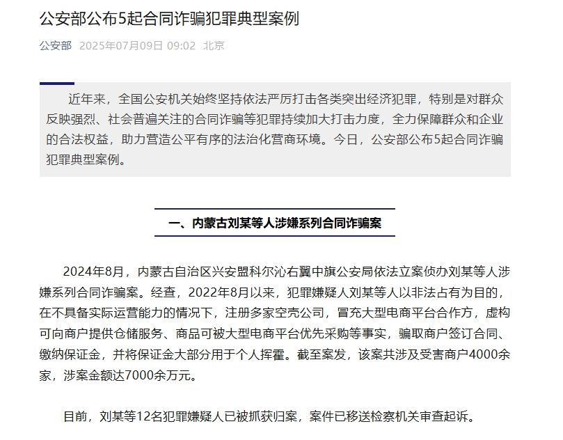 2024年8月,內(nèi)蒙古自治區(qū)興安盟科爾沁右翼中旗公安局依法立案?jìng)赊k劉某等人涉嫌系列合同詐騙案。經(jīng)查,2022年8月以來(lái),犯罪嫌疑人劉某等人以非法占有為目的,在不具備實(shí)際運(yùn)營(yíng)能力的情況下,注冊(cè)多家空殼公司,冒充大型電商平臺(tái)合作方,虛構(gòu)可向商戶提供倉(cāng)儲(chǔ)服務(wù)、商品可被大型電商平臺(tái)優(yōu)先采購(gòu)等事實(shí),騙取商戶簽訂合同、繳納保證金,并將保證金大部分用于個(gè)人揮霍。截至案發(fā),該案共涉及受害商戶4000余家,涉案金額達(dá)7000余萬(wàn)元。