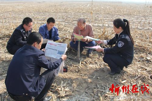 怎樣把《中華人民共和國(guó)大氣污染防治法》和《五臺(tái)縣人民政府嚴(yán)防森林火災(zāi)的通告》宣傳到人?五臺(tái)縣環(huán)境保護(hù)局、環(huán)境監(jiān)察大隊(duì)分組劃片,組織環(huán)保人員深入到田間地頭,面對(duì)面讀報(bào)給農(nóng)民聽(tīng),手遞手散傳單讓農(nóng)民看,為農(nóng)民解釋燒秸稈、燒地堰、燒荒等野外違規(guī)用火行為的危害。臺(tái)城鎮(zhèn)西關(guān)村66歲的農(nóng)民張存在就高興地對(duì)縣環(huán)境監(jiān)察人員說(shuō):“你們這樣解釋?zhuān)鄱?,“地頭環(huán)保”咱農(nóng)民也記得牢,我家4畝地的秸稈保證不燒一根,咱漚糞去,多打糧,又不污染?!眻D為地頭宣傳環(huán)境保護(hù),增強(qiáng)農(nóng)民環(huán)保意識(shí)。(金俊賢 攝)