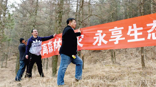 清明節(jié)來臨之際,靜樂公路管理段駐赤泥窊鄉(xiāng)范家洼村扶貧工作隊深入開展護林防火宣傳。圖為工作隊員深入林區(qū)懸掛護林防火標(biāo)語。(李永珍 攝)