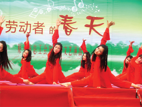 為慶祝即將到來的五一國(guó)際勞動(dòng)節(jié),原平市總工會(huì)于近日組織各基層工會(huì)的群眾演員赴原平市經(jīng)濟(jì)技術(shù)開發(fā)區(qū),給奮戰(zhàn)在一線的工人師傅送去了精彩的文藝節(jié)目。圖為演出現(xiàn)場(chǎng)。(賈政卿 攝)