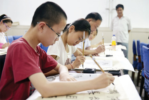 7 月17 日,在靜樂縣青少年文化活動中心,孩子們正在認真練習書法。進入暑期以來,該縣興趣特長班又火熱起來,學生們利用暑假時間投身于各自的興趣愛好之中,讓自己的假期變得更為充實、更有意義。(閆曉梅 攝)