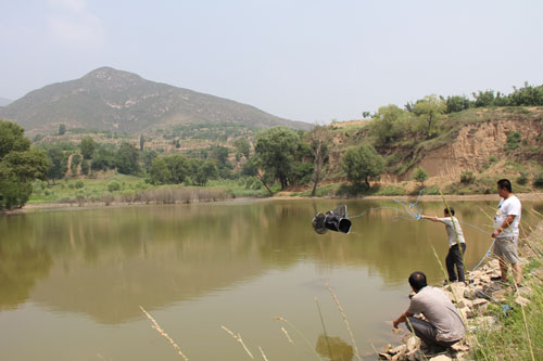 “昔日有水水白流、只見黃土不見魚”的五臺縣陽白鄉(xiāng)桑院村,在五臺農(nóng)商銀行陽白支行信貸人員的倡導(dǎo)下,依靠“項目攻堅”、“金融扶貧”、“農(nóng)貸進萬家”等惠民政策,在黃土塬上打壩蓄水建起20畝魚塘,投放鯉魚、白鰱魚等魚苗2萬尾,3斤以上的鮮魚已讓山里人大飽口福。圖為網(wǎng)袋捕魚。(俊賢 鄭光 先良)
