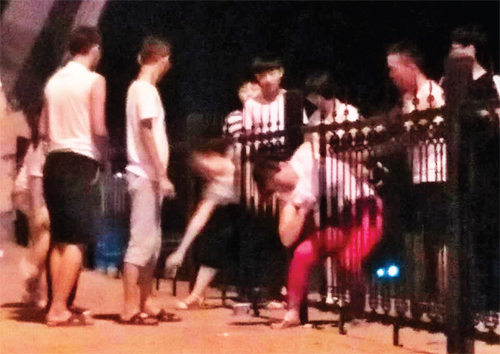 8月9日晚21點(diǎn)左右,在城區(qū)云中河景區(qū)游園乘涼的市民依然絡(luò)繹不絕。一群十五六歲學(xué)生模樣的青年將幕山橋上的鐵柵欄分開,一個(gè)個(gè)鉆過隔離欄魚貫而出,引來橋上欣賞夜景的市民們一片譴責(zé)之聲。