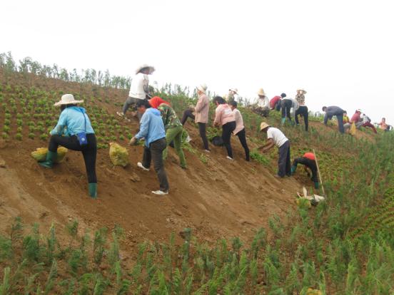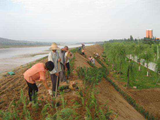 8月24日,河曲縣城北防護(hù)堤上植綠場面熱火朝天:數(shù)十名工人在堤上成排栽植爬地柏,坡面栽成菱形邊;菱形內(nèi)外栽植花草“三七景天”;園林綠化車輛跟進(jìn)澆水。