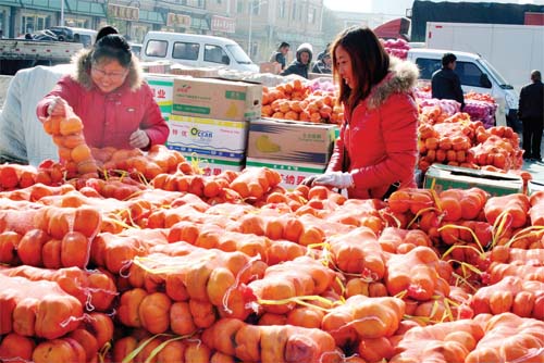 11月11日,原平市農(nóng)貿(mào)市場上紅紅火火,這是市民們正在挑選金黃色柿子。該市合理化布局建市場,使農(nóng)副產(chǎn)品有了好的銷售平臺,既方便市民購買又促進農(nóng)民增收。(趙春曉 攝)