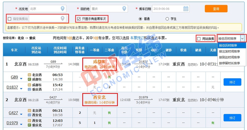 2、換乘過程中,存在同站換乘和不同車站換乘兩種情況。在列車余票信息頁面,旅客可根據(jù)需求,對“指定換乘站”“只顯示有座席車次”“同站換乘”等信息進(jìn)行勾選。此外,車票信息還可以根據(jù)總歷時(shí)、出發(fā)、到達(dá)、停留時(shí)間進(jìn)行排序。