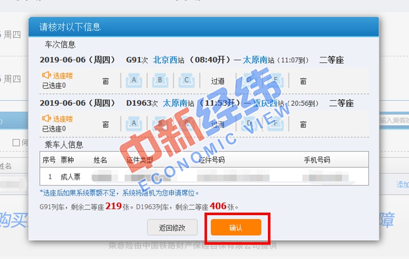 4、一切準(zhǔn)備就緒后,就可進(jìn)行車票預(yù)訂了。點(diǎn)擊“預(yù)訂”后,系統(tǒng)會(huì)再次對換乘信息進(jìn)行提示,確認(rèn)無誤后選擇對應(yīng)車次所需席別,添加乘車人信息。