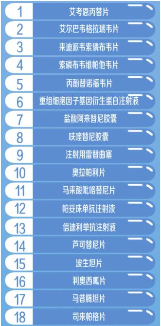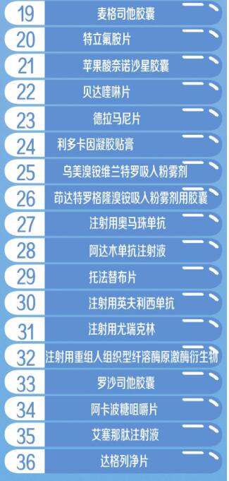 國家醫(yī)保局醫(yī)藥服務(wù)管理司司長熊先軍介紹,此次談判成功的藥品多為近年來新上市且具有較高臨床價值的藥品,涉及癌癥、罕見病、風(fēng)濕免疫、心腦血管、消化等10余個臨床治療領(lǐng)域。重點(diǎn)領(lǐng)域的5個基本藥物全部談判成功,22個抗癌藥、7個罕見病用藥、14個慢性?。ê悄虿?、乙肝、風(fēng)濕性關(guān)節(jié)炎等)用藥、4個兒童用藥談判成功,進(jìn)一步優(yōu)化了目錄結(jié)構(gòu)。