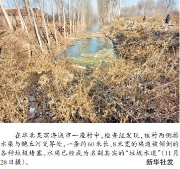 在華北某濱海城市一座村中,檢查組發(fā)現(xiàn),該村西側(cè)排水渠與鮑丘河交界處,一條約60米長(zhǎng)、8米寬的渠道被傾倒的各種垃圾堵塞,水渠已經(jīng)成為名副其實(shí)的“垃圾水道”。而在該村東北水渠河長(zhǎng)公示牌附近就有生活污水直接排入,水面漂浮綠色青苔、白色泡沫,散發(fā)刺鼻惡臭。