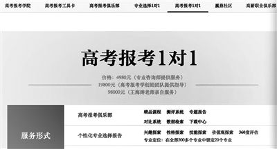 北青報記者發(fā)現(xiàn),面對考生家長對于志愿填報的“迫切需求”,目前高考志愿填報咨詢的價格都在幾千元到幾萬元不等。這位潘姓工作人員表示,該機(jī)構(gòu)設(shè)有線上、線下志愿填報兩套方案,其中線上填報方案價格為3980元,志愿填報咨詢老師與學(xué)生并不見面,而是通過QQ、郵件等方式為學(xué)生和家長出具志愿填報方案。而線下志愿填報方案為1對1有針對性的填報,但是根據(jù)咨詢經(jīng)驗的多寡收費(fèi)也不相同。“比如我們有七八年行業(yè)經(jīng)驗的呂老師收費(fèi)是22800元,有6年經(jīng)驗的郭老師收費(fèi)是20800元,要是有3年經(jīng)驗的李老師收費(fèi)則為16800元?!贝送?,一家名為融聚未來的機(jī)構(gòu)的高姓負(fù)責(zé)人也向記者介紹,該機(jī)構(gòu)高考志愿填報1對1服務(wù)的價格在8000元到2萬元以內(nèi)。最讓人吃驚的是,一家名為贏鼎教育的高考報考機(jī)構(gòu),在官網(wǎng)上明示的高考報考1對1項目中明確標(biāo)價,專業(yè)咨詢師提供服務(wù)的收費(fèi)4980元,高考報考學(xué)創(chuàng)始團(tuán)隊提供指導(dǎo)的收費(fèi)為19800元,王海濤老師親自服務(wù)的標(biāo)價為98000元。