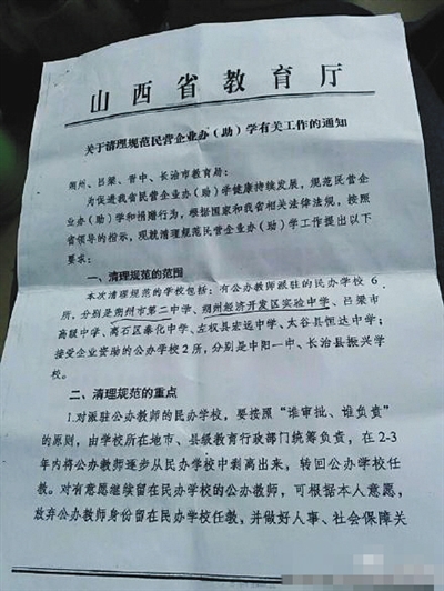 新京報(bào)記者看到,文件名為《關(guān)于清理規(guī)范民營企業(yè)辦(助)學(xué)有關(guān)工作的通知》,加蓋有山西省教育廳公章。文件中明確提出,“在2-3年內(nèi)將公辦教師逐步從民辦學(xué)校中剝離岀來,轉(zhuǎn)回公辦學(xué)校任職。”