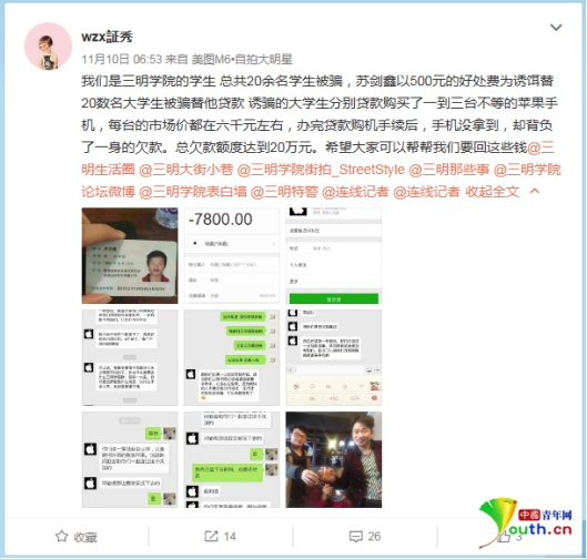 近日福建三明學(xué)院有學(xué)生發(fā)微博稱(chēng),自己與多名同學(xué)被誘騙貸款買(mǎi)手機(jī),辦完貸款購(gòu)機(jī)手續(xù)后,手機(jī)沒(méi)拿到卻背了一身債務(wù)。20名大學(xué)生總欠款額度達(dá)20多萬(wàn)。